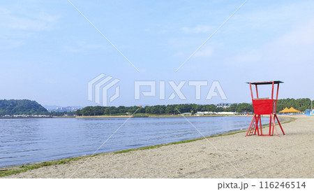 コロナ禍で人出で少ない東京湾の横浜市金沢区人工渚の夏