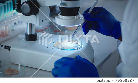 A male researcher in the laboratory examines meat, a team of scientists conducts experiments with artificially grown food, an Asian man and a woman in white medical coats test drugs.