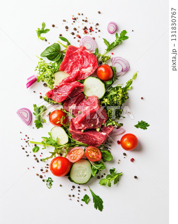 Dynamic pieces of floating raw meat steaks with ingredients and vegetable food preparation isolated on white background