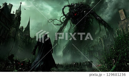 Gloomy Victorian City Confronting a Sinister, Tentacled Horror