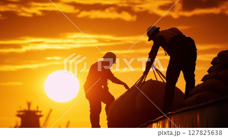 two workers in silhouette, wearing hard hats and clothing, are situated on the side of a structure at sunset. they are in the process of lifting a large sack or load