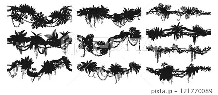 Tropical jungle forest liana branch silhouettes of rainforest ivy leaves, vector icons. Tropical liana or creeping jungle tree and bindweed plant with curly tendrils and rainforest monstera leaves