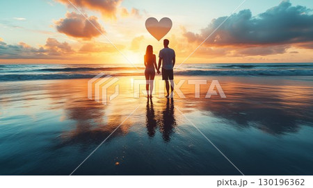 Young couple holding hands on beach at sunset with heart shape above, representing romance and relationship concept in natural setting
