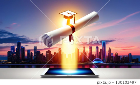glowing diploma emerging from tablet with futuristic skyline symbolizes transition from online learning to future jobs, showcasing innovation and education