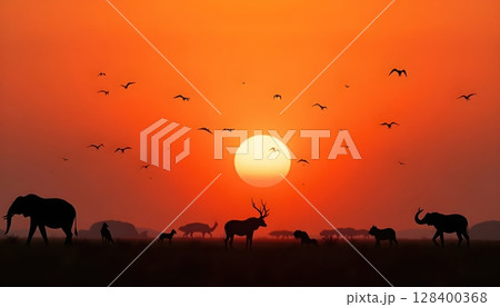 Colorful savanna landscape at dusk, wildlife in silhouette, artistic nature illustration, elegant trees