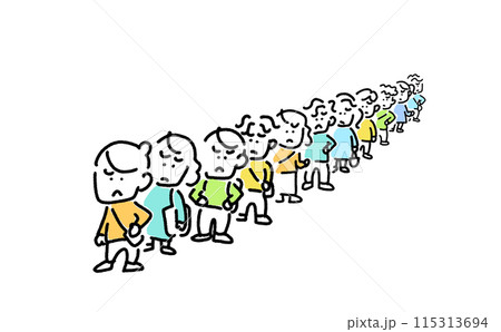 行列に並ぶ人々 老若男女 イライラ 待ち時間 ストレス シンプルで可愛い線画イラスト