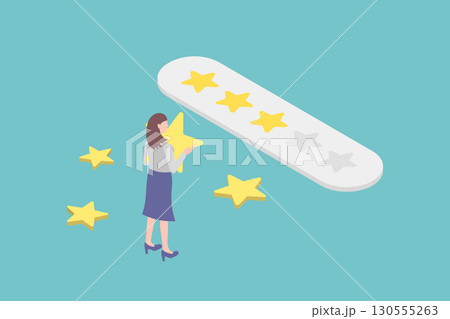 レビュー・口コミ・評価をする女性のイラスト素材(ベクター、アイソメトリック風)