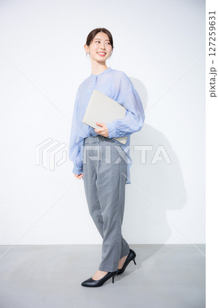 白バックでパソコンを持つ水色のシアーシャツの振り向く女性 転職や人事などのリクルートのイメージ