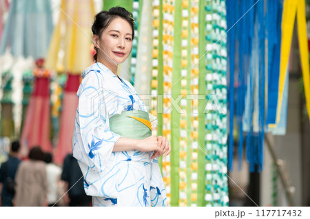 浴衣がかわいい美人な日本人女性 日本の夏 正面のカメラ目線