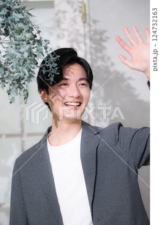 ジャケットを着て木陰で見上げる男性 待ち合わせなどで見上げる手を振る