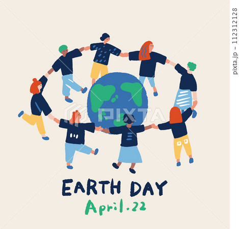 アースデイをイメージする手を繋ぐ人々と地球のイラスト