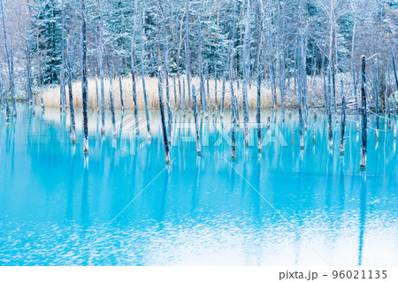 北海道の冬の訪れ うっすらと雪が積もった美瑛町の青い池