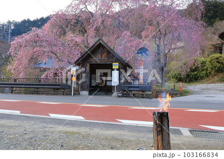 檜原村人里のバス停の垂れ桜と自転車