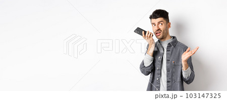 Angry guy shouting at speakerphone, scream on mobile phone, leaving angry voice message, standing against white background