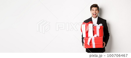 Concept of christmas holidays, celebration and lifestyle. Image of handsome amazed guy in suit, holding new year presents and smiling, standing against white background