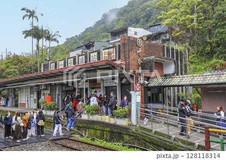 台湾の十份駅 到着ホームから改札口へ向かう観光客