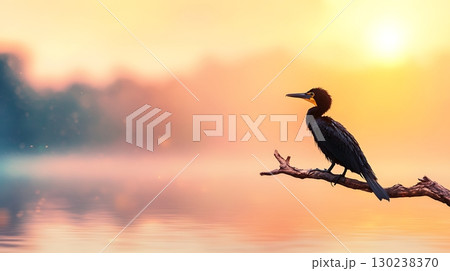 Silhouette of Bird Perched on Branch Against Sunrise Over Calm Water Surface