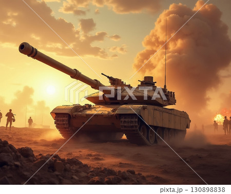 Military tank advancing through a desert landscape during sunset with silhouettes of soldiers in the background
