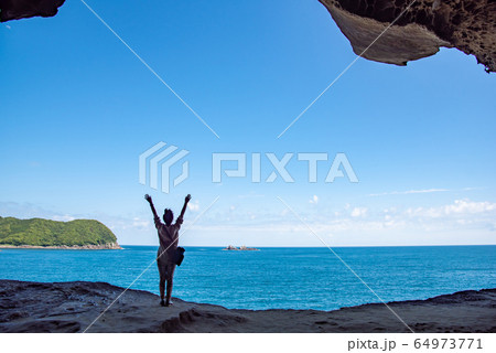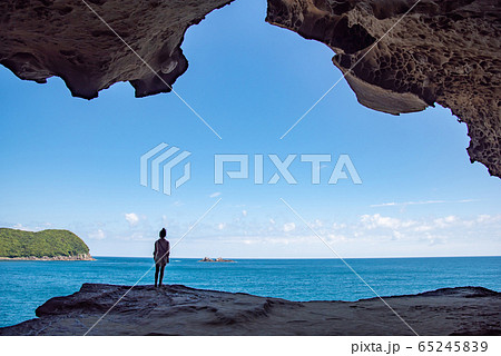 三重県 熊野市 鬼ヶ城 海を眺める女性