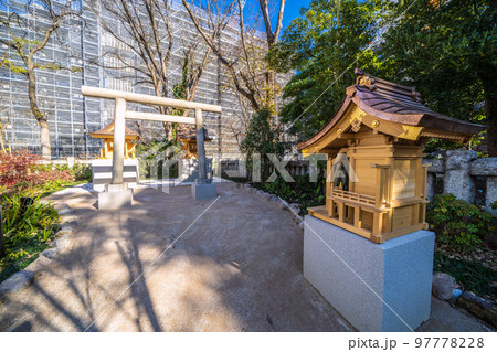 日本の東京都市景観 八幡神社の境内(人麿社、稲荷社)。周辺では虎ノ門・麻布台プロジェクトが進行中