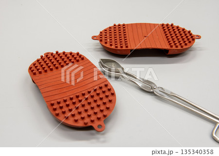 silicone hot pads and forceps on gray table in laboratory.
