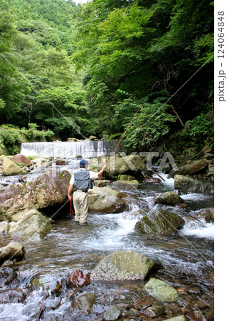 大滝林道から三階滝沢歩道に入って上流を目指す釣り人