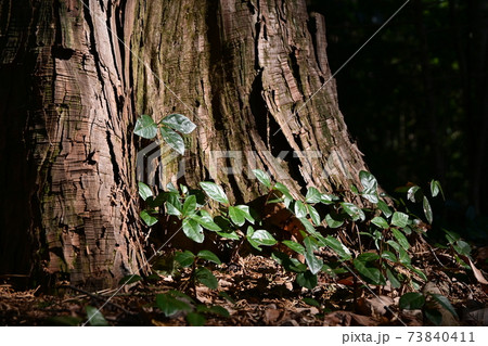 仄暗い森に差し込む一筋の光 巨大なヒノキと若い常緑樹
