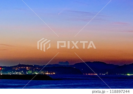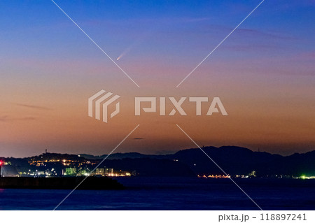 紫金山・アトラス彗星が夜明け前に湘南の海に昇る