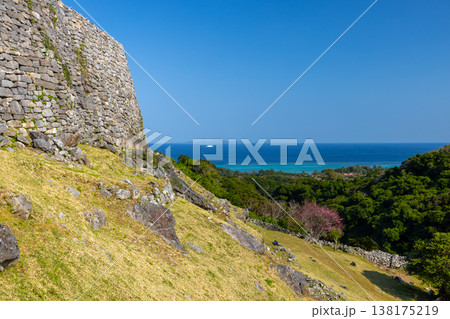 沖縄県国頭郡今帰仁村今泊 世界文化遺産今帰仁城跡の早咲きの琉球寒緋桜と城跡の景色