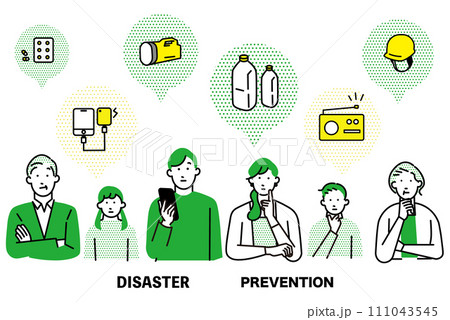 地震ー津波被害ー火事ー災害に備えるー防災のことを話し合う家族ーベクターアイコンセットイラスト素材