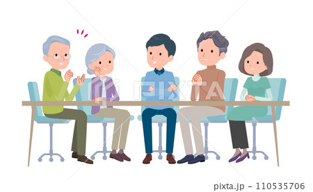 テーブルで会話。楽しい雰囲気の夫婦とその両親。