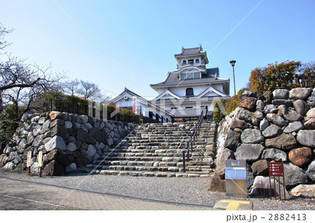 春の滋賀県長浜市の豊公園(ほうこうえん)の遊歩道から模擬天守(長浜城歴史博物館)方面を見る