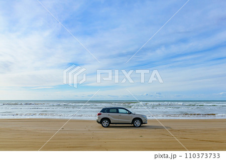 北陸地方・千里浜なぎさドライブウェイの海辺と一台の車