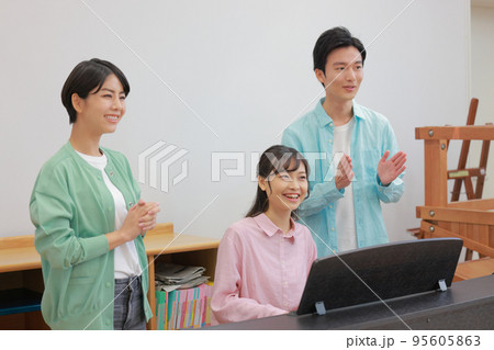 ピアノを弾きながら歌う保育士の男女_カメラ目線1