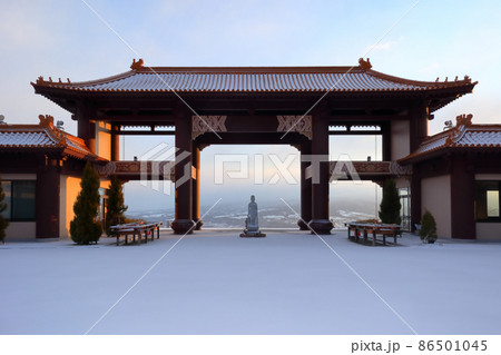 風の群馬気まま旅(穢れの無い銀世界に朝の光が差す時、観音様の沈黙の祈りはつづく。佛光山法水寺)渋川市