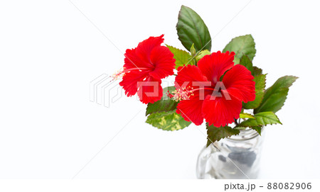 Hibiscus flower with leaves in vase on white background.