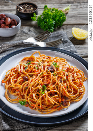 Herring fillets spaghetti pasta in tomato sauce. Pasta sardines.