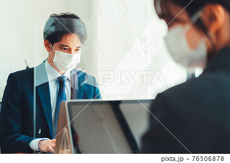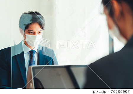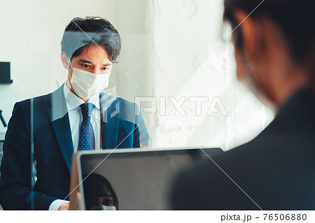 アクリル板を設置しているオフィスで働く社員