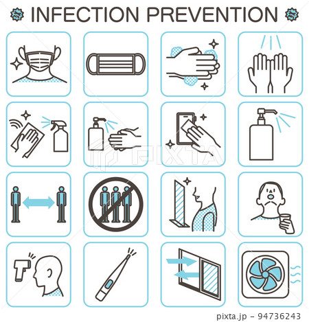 コロナウイルスや風邪、インフルエンザなど感染予防のベクターイラストアイコンセット