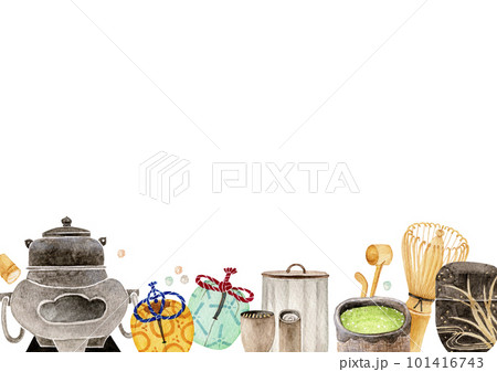 茶道 お点前 備前焼 水差し 水指 御点前 茶せん 茶筅 茶杓 茶碗 抹茶茶碗 お抹茶 日本間 備前 焼き物 お稽古 習い事 和 和風 おもてなし 心 茶巾 畳 イラスト 手描き 水彩 バックグラウ