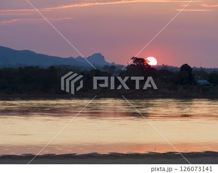 タイ・ナコンパノム メコン川越しに望む日の出とラオスの山並み / Nakhon Phanom