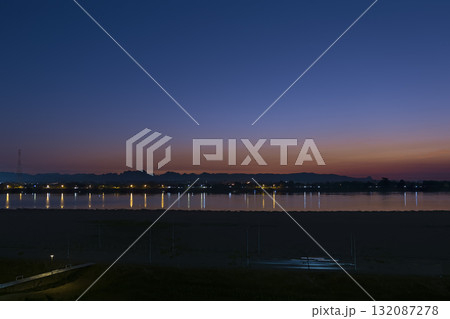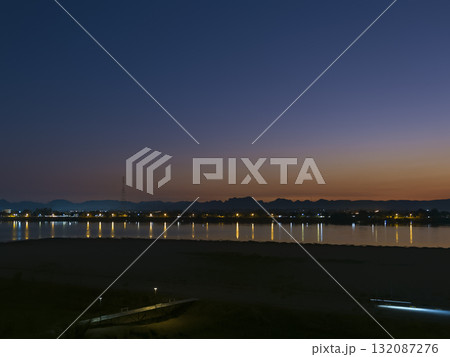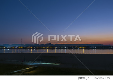 タイ・ナコンパノム メコン川の夜明けとラオスの山並み Nakhon Phanom, Thailand