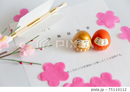 入試の合格証書とダルマ、合格祈願の破魔矢、桜の花びら