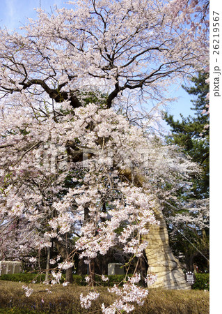 保存樹木となっている樹齢約280年のシダレザクラ枝垂桜が春の陽気で満開の仙台市都心部の榴岡公園