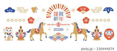 年賀状 デザイン用 馬の親子の手書き和風筆イラスト