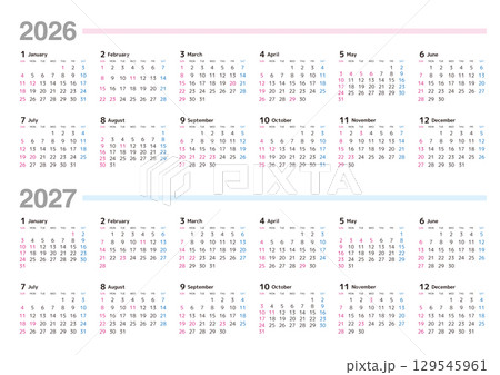 2026-2027年 年間カレンダー 日曜始まり 日本の祝日表記はありません