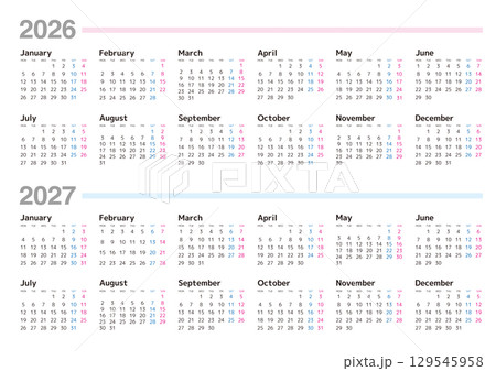 2026-2027年 年間カレンダー 日曜始まり 日本の祝日表記はありません。