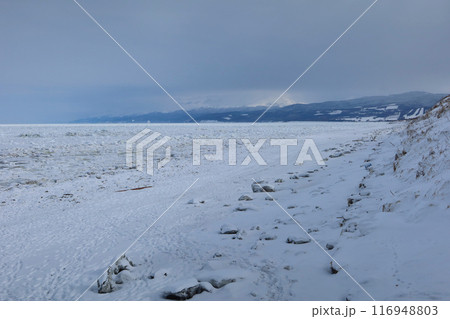 冬の以久科原生花園と雲がかかった海別岳 北海道