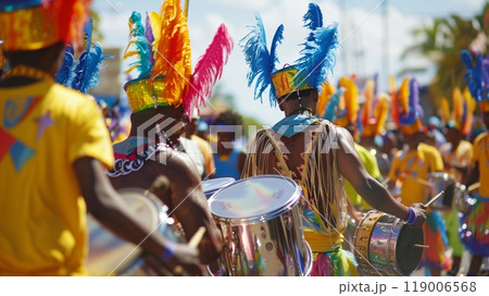 A vibrant Caribbean carnival features steel drum bands, feathered costumes, street dancers, and festive joy.