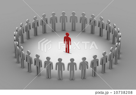 人型アイコンの円陣風景、1人の赤いアイコンを青い群衆が取り囲む